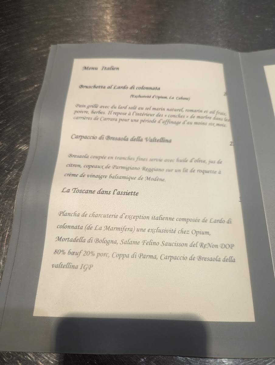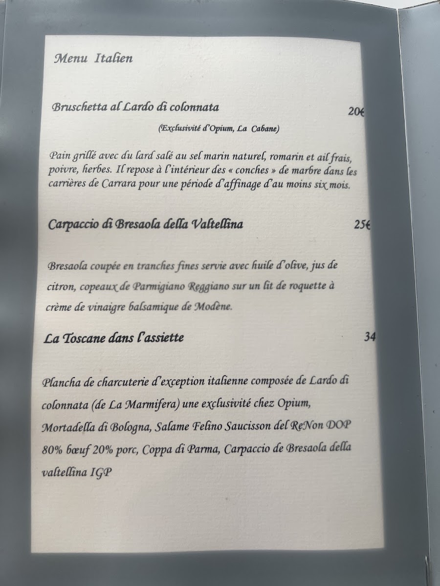 Opium, La Cabane Menu